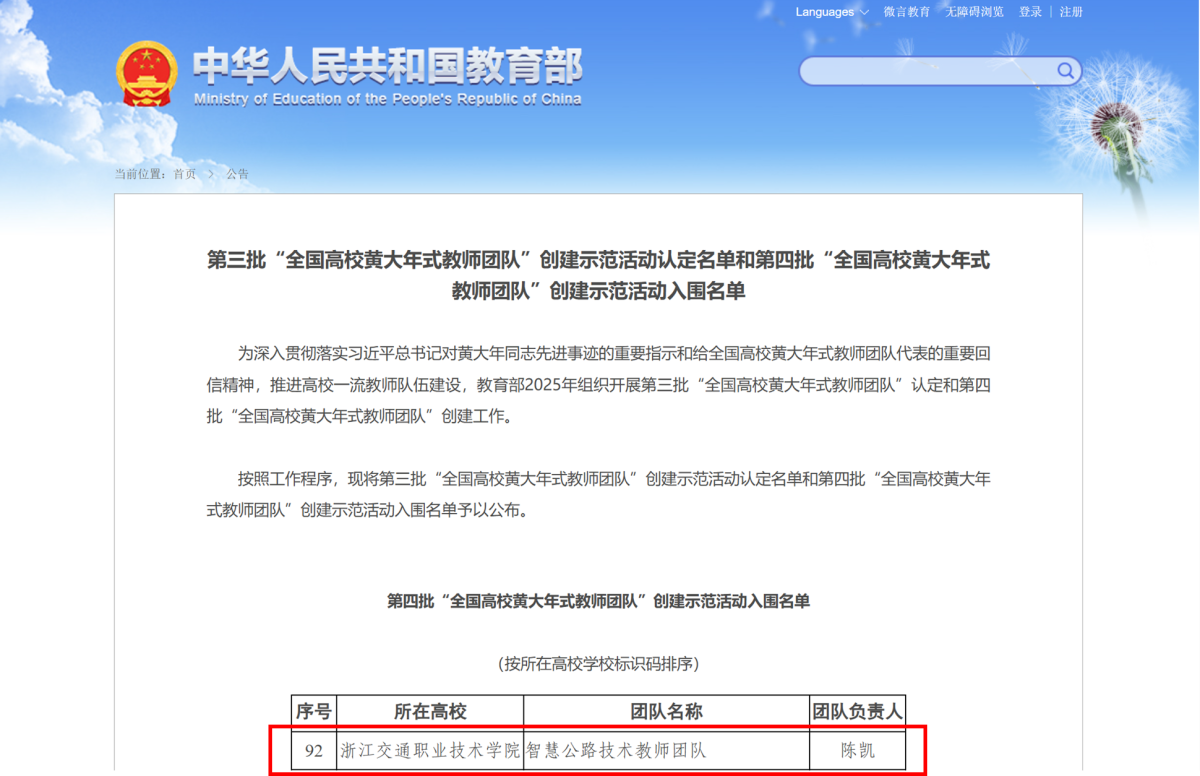 近日,教育部公布第四批“全国高校黄大年式教师团队”创建示范活动入围名单,我校智慧公路技术教师团队成功入选。这是我校聚力推进第二期国家“双高计划”专业群建设取得的又一项国家级重要标志性成果,也是我校持续打造高水平“双师型”教师队伍实现的重大突破!