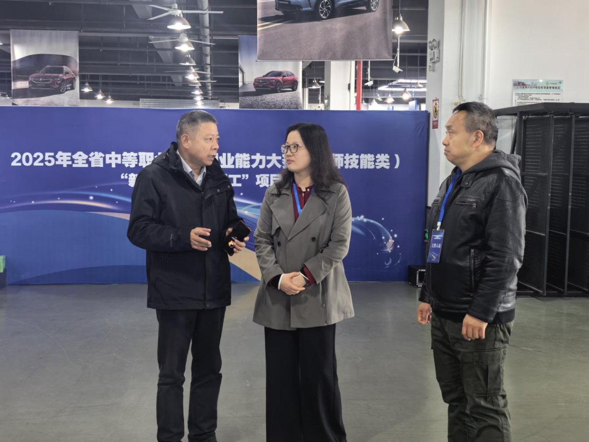 赛场上选手们以精湛技艺诠释“工匠精神”,以创新实践彰显职教魅力,集中展示了我省汽车类专业高技能人才的全新风貌。赛事坚持“以赛促教”,推动教师更新教育理念、改进教学方法、提升教学质量,实现专业能力持续跃升。此次赛事得到教育厅领导的高度重视,浙江省教育厅职成教教研室教研员俞佳飞莅临指导工作。汽车学院党总支书记、院长朱福根就赛事运作进行工作汇报,并陪同观摩赛事现场。