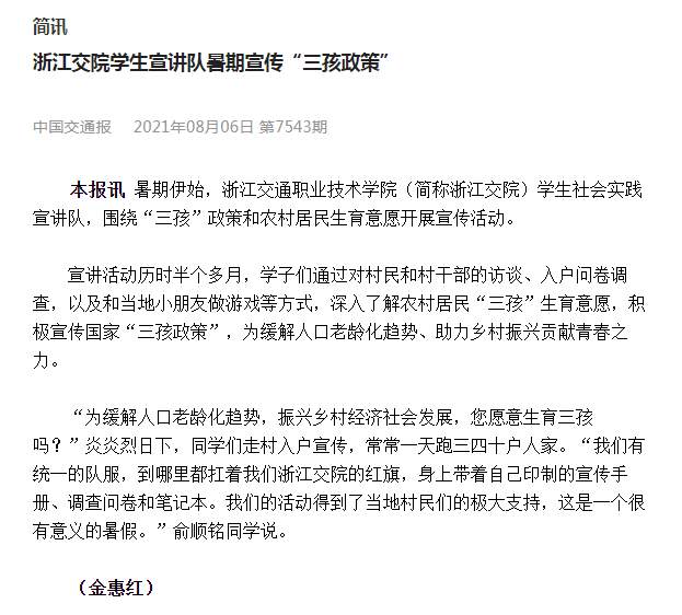 简讯 浙江1946伟德学生宣讲队暑期宣传“三孩政策” (591adb.com)