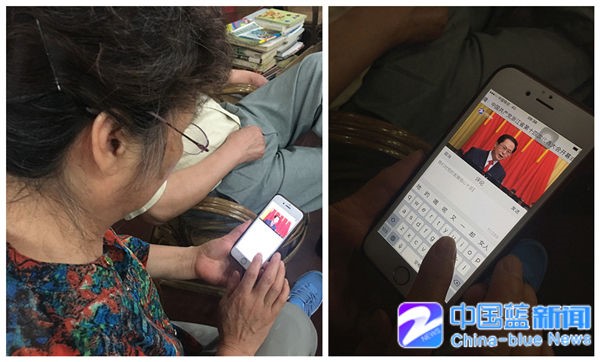在杭州市抚宁巷附近的彩霞岭社区,一群老人正在阅览室里聚精会神的看着浙江卫视。电视机里正在直播浙江省第十四次党代会的开幕式。而老党员马世恭则从口袋里拿出了手机,熟练的点开了中国蓝新闻客户端,看起了网络直播:“你看,清不清楚,是不是和电视一样?” 一旁的老党员马娥娟羡慕地问:“能不能给我也下一个?”