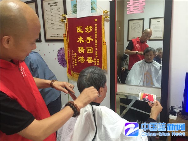 除了各大学校、社区、企事业单位外,很多网民也都在自发的观看开幕式。在“公益达人”张能庆的银丝坊,他一边给老人们免费理发,一边通过手机,和老人一起收看开幕式直播。