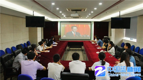 同学们通过中国蓝新闻客户端收看开幕式直播