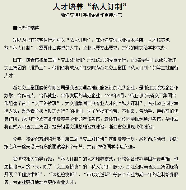 浙江工人日报:人才培养“私人订制”
