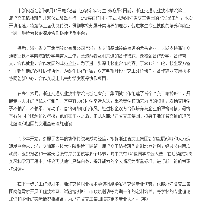 中新网:第二届“交工路桥班”开班校企合作“订制”人才