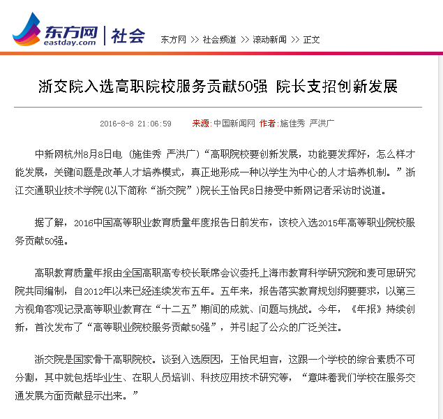 东方网报道我校入选全国高职院校服务贡献50强