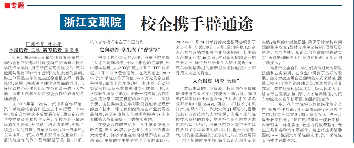 上一条:《中国教育报》:依托“三梯次”校企合作推进高职汽车专业人才培养模式改革