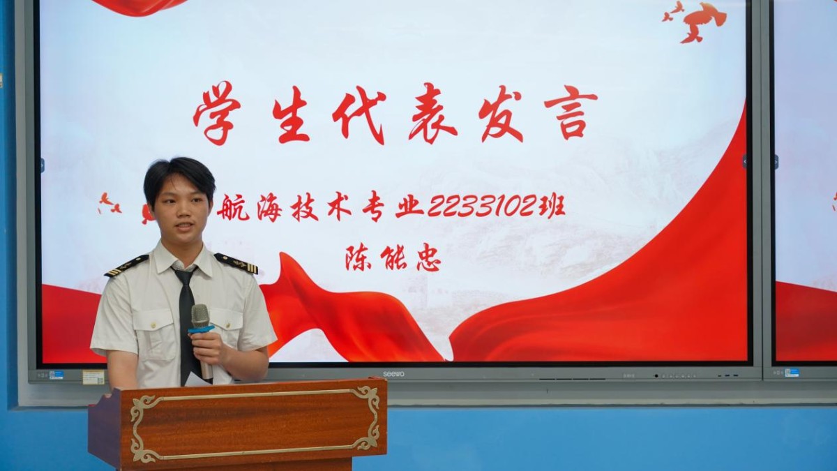 2025届航海技术专业毕业生陈能忠同学代表全体获奖学生上台发言。他饱含深情地表达了对协海集团设立奖学金、助力学子成长的感激之情。陈能忠表示,这份荣誉既是对过往努力的肯定,更是对未来征程的鞭策。